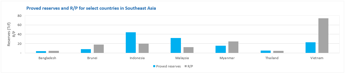 What makes this slightly odd, is this Vietnam has a huge amount of undeveloped gas resources that could have prevented this situation from arising. From the chart below we can see that Vietnam has the third largest proved gas reserves in Southeast Asia, behind only Indonesia and Malaysia. It also has by far and away the largest R/P ratio, with sufficient reserves to maintain current production levels for nearly 75 years.