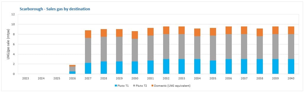 I looked at the gas balances at the various west coast LNG plants in my article on January 3, 2023. The chart below captures this for Scarborough gas, with the addition of the domestic market sales.