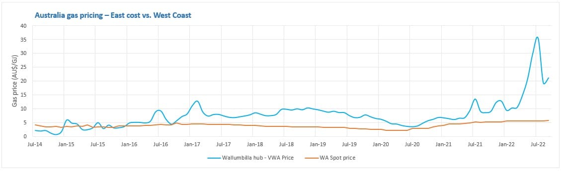 To illustrate this, the chart below compares some of the published price points for the gas markets in Western and Eastern Australia. The Western Australia data comes from gasTrading and the Eastern price is the volume weighted average price at the Wallumbilla Gas Supply Hub, as published by the Australian Energy Regulator (AER).