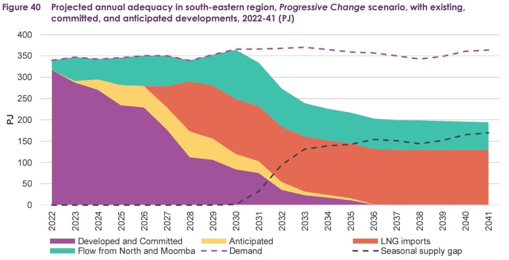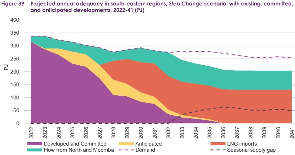 In the two scenarios, the “Developed and Committed” and “Anticipated” wedges are the same, with the difference being a 1-year shift in when LNG imports begin as well as some variance in the “Flow from North and Moomba”. Both scenarios show a seasonal supply gap starting the early-2030s, which would either need to be filled by new domestic gas developments (that aren’t already anticipated) or by more LNG imports.