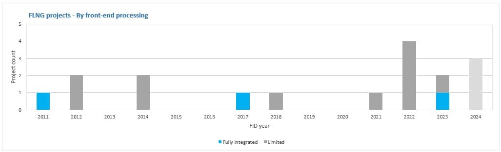 One of the key considerations for an FLNG unit is the degree of integration of upstream processing facilities (separation, liquids processing, gas processing etc.) into the FLNG vessel. The more integration of these facilities, the more specialised the vessel and therefore the more challenging it would be to relocate the vessel. I have split the project list into two primary processing choices: