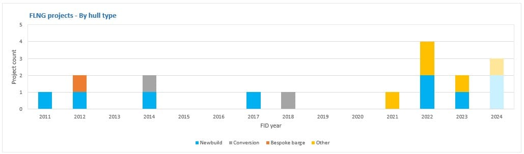 - Other: the option to use other types of hull is opened up when a separate LNG carrier is used to store the produced LNG. NFE's solutions are the first here, with Fast LNG 1 being based on the conversion of three jack-up rigs and Fast LNG 2 and 3 based on the conversion of circular-design floating drilling rigs. I have also classified the second phase of Greater Tortue Ahmeyim FLNG in this category as the design is based on a GBS structure, similar to that of the Adriatic LNG import project.