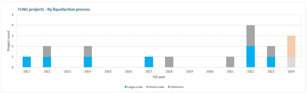 - Large-scale: these processes offer single trains from 2 to 12 mtpa and were generally developed for baseload onshore liquefaction plants. The trend had been for increasing scale of processes and increasing efficiency. Therefore, they will generally offer better efficiency (lower OPEX / fuel gas consumption) but can be more complex and don't operate so well at reduced throughputs (turn-down). Therefore, these processes tend to be best applied where this is certainty around both supply and offtake.