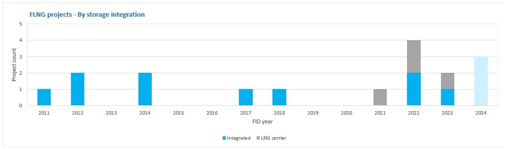 - Integrated: Traditionally, the FLNG vessel would cover, at a minimum, the liquefaction and storage of the LNG. All of the operating FLNG vessels currently have the storage integrated.