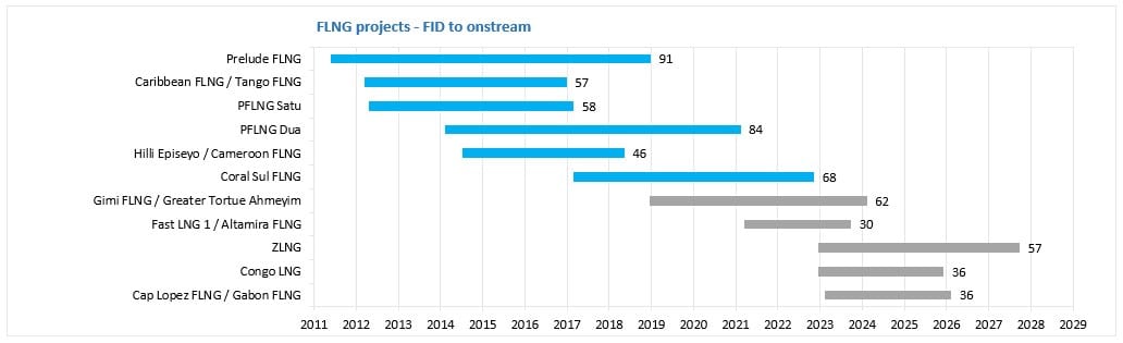 So, where could FLNG fit it? I see it as unlikely that a full-scale FLNG development would be approved as this would not look great for President Joko Widodo, who rejected an FLNG-based development in 2015. However, where it could present an interesting option would be to install an FLNG vessel of a limited capacity (maybe 2-3.5 mtpa) whilst the pipeline and onshore facilities are developed. This will both hedge some of the risk related to the pipeline challenges and could allow earlier monetisation, see below for historical durations from FID to coming onstream for FLNG vessels.
