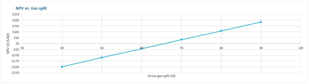 Secondly, if the government want the LNG to be directed to the local market, with a price cap of $6/MMBTU (at point of use), there may also need to be some flexibility on the fiscal terms. The Seram (Non-Bula) PSC is under Gross Split terms, meaning it is easy for me to look at adjusting a single variable; the gross split for gas and see the impact this has on the project economics (NPV 10).