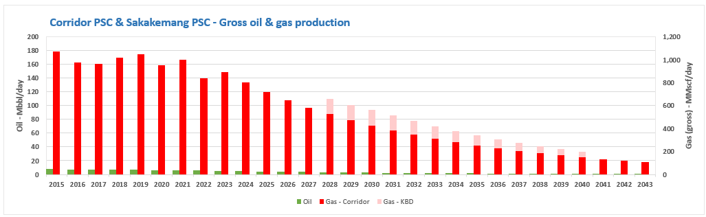 The oil and (gross) gas production for the two PSCs is shown below on a 100% basis. The historical data comes from both government and company reports which I have tried to make consistent. The forecast for Corridor based on some simple decline assumptions. For Kaliberau Dalam, I have assumed production will start in 2028.