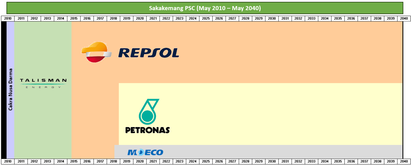 The Sakakemang PSC was offered in the second bidding round of 2009 and was officially awarded in May 2010 to Cakra Nusa Darma (SKKMG) Ltd (100% + operator). By the time Repsol acquired Talisman, they owned 100% of the asset and they have since divested stakes to both MOECO and PETRONAS.