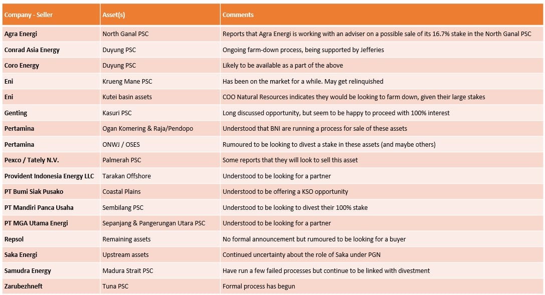 - Repsol: have divested from the rest of Southeast Asia but have held onto Indonesia, albeit with a reduction in their holdings in recent years. Their major interests are now the producing Corridor PSC and the Sakakemang PSC that contains the once vaunted Kaliberau Dalam discovery. This year saw little in the way of movements but the rumours of potential exit continue, with MedcoEnergi are still the obvious buyer if they can reach a deal.