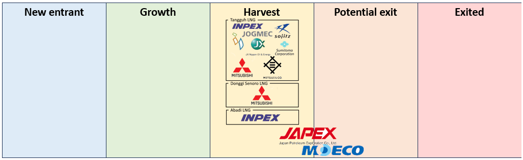 Japan has a long history with oil and gas in Indonesia but this has significantly shrunk over the last decade owing to the expiry of legacy PSCs. The majority of the remaining interest is in the LNG export projects but some smaller holdings are also maintained.