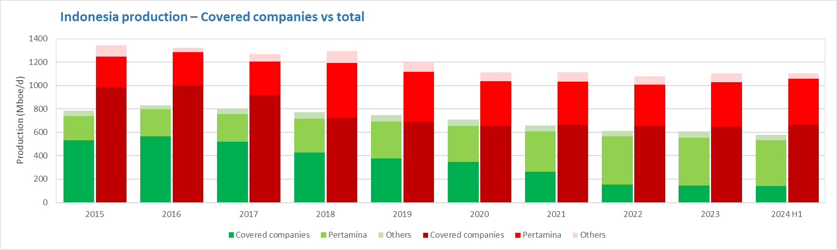 Back in 2015, the working interest production of the major IOCs made up over 41`% of Indonesia's production. By 2022, that have fallen to under 14% but has recovered slightly from there to almost 17% by the end of the first half of 2024. The loss of Chevron's stake in the Rokan PSC and TotalEnergies stake in the Mahakam Offshore PSC at their expiries played a big part in the reduction.