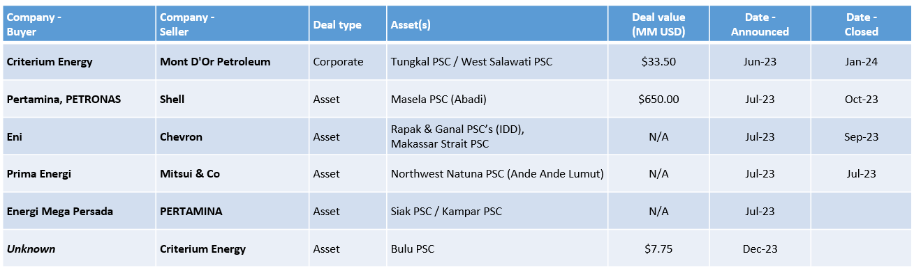The early-part of the year saw little in terms of M&A, with the first deal only coming in June. We then had the two "big" deals announced at July's IPA conference, with three smaller deals coming after this. The table below summarizes the M&A deals announced in Indonesia in 2023.