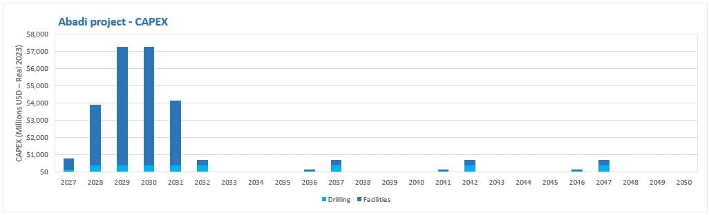 - FPSO: the Abadi FPSO will have a gas processing capacity of 1,750 MMscf/d, which is more than double the Barossa FPSO that is currently being being constructed by MODEC. Unlike the Barossa FPSO (which is leased), the Abadi FPSO is likely to be operator-owned. Inlet compression may be required later in the field life but I have not made any allowance for this.