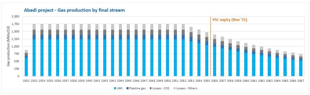 In terms of production rates, they have stated that the LNG liquefaction plant will have a capacity of 9.5 mtpa of LNG, with an additional 150 MMscf/d of gas sales being directed into the domestic market through local gas pipelines. To supply this, they have stated that the plateau gas production rate will be 1,750 MMscf/d, with a 20 year production plateau. The peak rate of condensate production is just over 35 Mbbl/d.