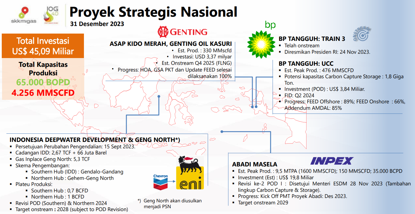 According to a recent presentation by SKK Migas, there are four national strategic oil and gas projects: Tangguh LNG, Abadi LNG, Indonesia Deepwater Development / Geng North, and Asap Kido Merah.