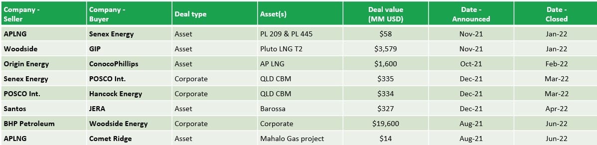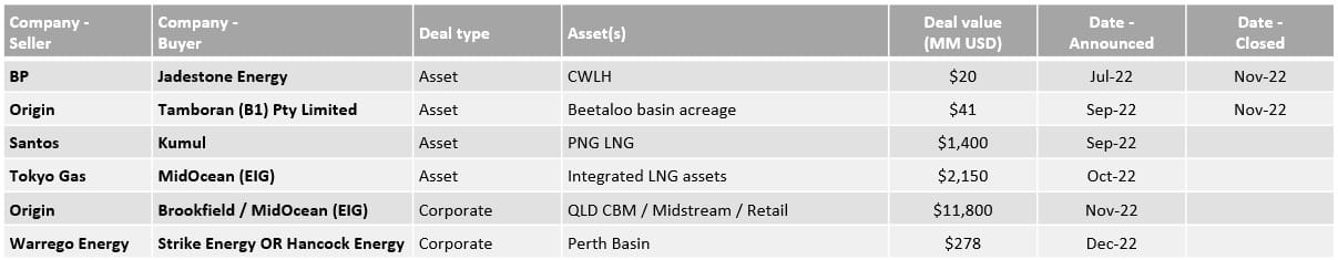 - Brookfield Asset Management and EIG (through MidOcean Energy) takeover of Origin Energy. After losing out to ConocoPhillips for a 10% stake in APLNG in 2021, EIG have come back to the table, together with Brookfield Asset Management to acquire Origin Energy. If completed, then EIG would take on Origin’s gas and LNG business, whilst Brookfield would take on their retail business.