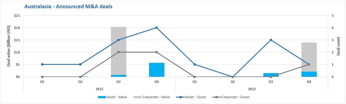 Oil and Gas related M&A transaction value decreased for both asset and corporate related transactions in 2022 vs 2021. However, there was plenty of activity, particularly in the second half of the year, with major transactions around the gas-to-LNG projects.
