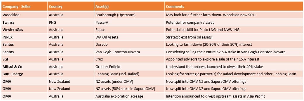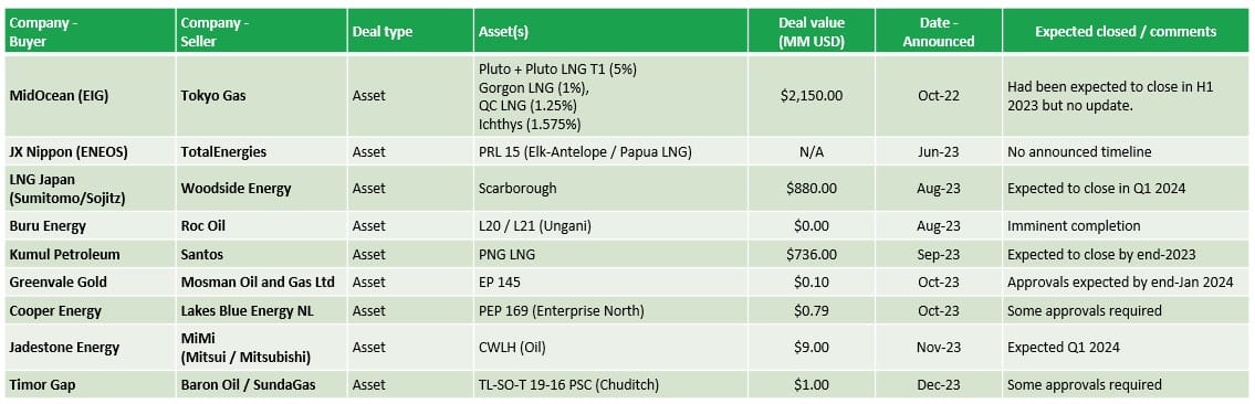 - In late-December, we saw completion of a deal that saw INPEX and TotalEnergies acquire PTTEP's 100% interest in the AC/RL7 permit that contains the undeveloped Cash-Maple gas field. INPEX have acquired 74% and TotalEnergies 26%. The deal was announced in mid-August.