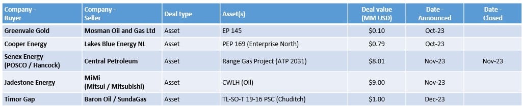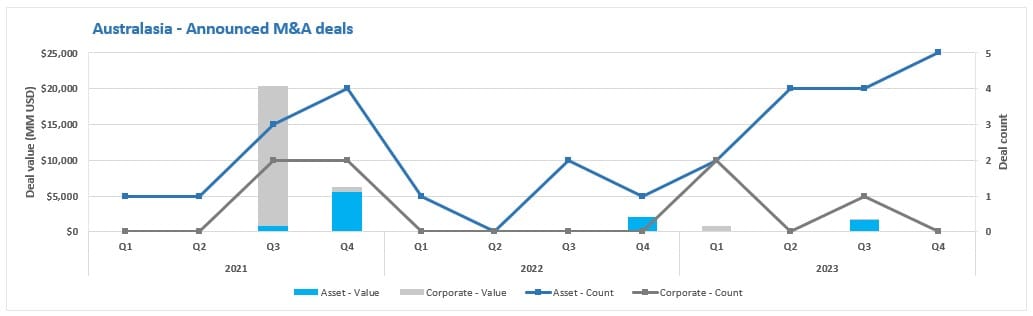 In terms of newly announced deals, Q4 saw five deals, four in Australia and one in Timor-Leste. A transaction value was announced for all of these deals, with a total deal value for these deals of almost US $19 million.