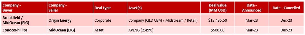- The first saw Origin Energy shareholders vote to reject a takeover offer from a consortium led by Brookfield asset partners and EIG. Together with a linked deal involving ConocoPhillips, this wiped nearly US $13 billion from the announced transactions for the year.