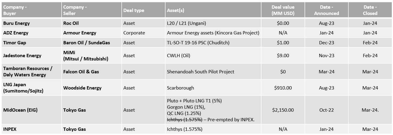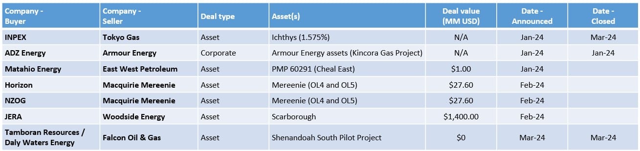 - The second deal came in late-January when ADZ Energy took over the assets of Armour Energy, who had been put into administration in November 2023. I believe the deal completed with the announcement.