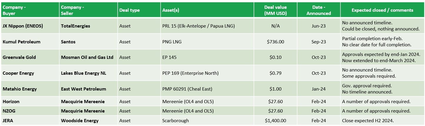 In addition to the above deals, we also saw the acquisition by TotalEnergies of OMV's stake in SapuraOMV. Whilst the focus of this deal was their Malaysian assets, the deal also included exploration acreage in New Zealand and Australia.