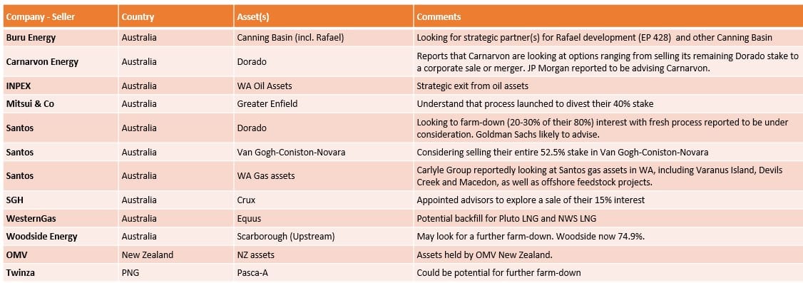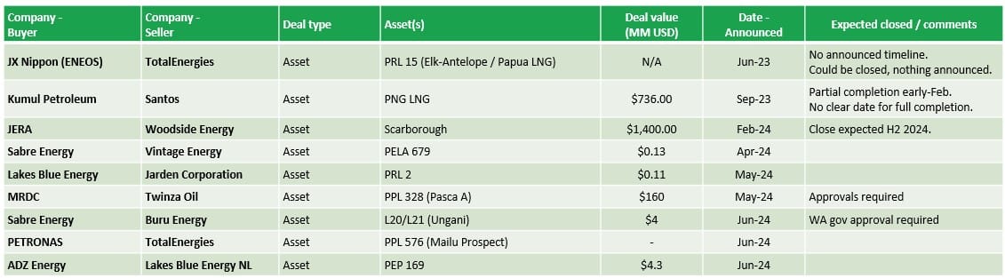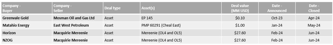 - In mid-February, Macquarie Mereenie announced two deals to divest their 50% interest in in the Mereenie field. Both deals were for 25%, with the buyers being Horizon and NZOG (both taking 25%). Both of these deals were completed in mid-June.