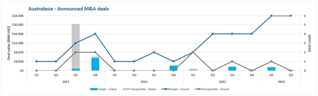 Q2 has seen six new deals announced in Australasia, four in Australia and two in Papua New Guinea. The transaction value of this one deal was about US $168 million.