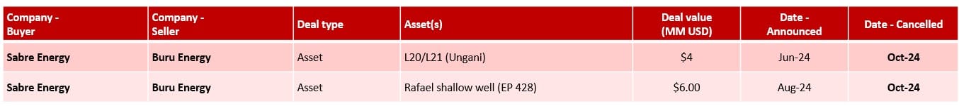- In early August, Buru Energy announced that it had entered into a Farm-in agreement with Sabre Energy for the drilling of the high impact Rafael Shallow oil target in EP 428 in Western Australia’s onshore Canning Basin. Under the agreement, Sabre will carry Buru for $6 million of the costs associated with the drilling and testing of the exploration well to earn a 50% interest in a commercial discovery and subsequent production licence. It is estimated that Sabre’s $6m will provide Buru with a full carry of the well. Subject to a commercial discovery being declared over the well, Sabre will pay Buru a further $1.5m in recognition of prior exploration expenditures incurred. However, this deal was cancelled at the end of September, together with a previous farm-in deal for the Ungani field, and has therefore not been included in the quarterly analysis.