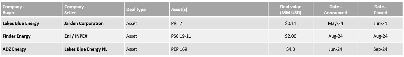 Q3 has seen five new deals (one of which was later cancelled) announced in Australasia, three in Australia and two in Timor-Leste. The transaction value for these five deals was about US $12.3 million. Excluding the cancelled deal, we have four deal, with a value of US $6.4 million.