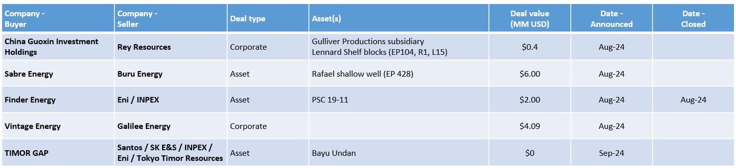 - In mid-August, Vintage Energy announced that they had agreed an all scrip merger with Galilee Energy with a deal value of AUD 6.1 million (~USD 4.1 million). The deal is still pending relevant approvals including Galilee Energy raising at least AUD 2.5 million from capital raising. Galilee Energy brings CSG assets in Queensland including the Glenaris gas project, whilst Vintage Energy brings production from the Odin and Vali gas fields in the Cooper basin as well as exploration interest in the Otway, Galilee and Bonaparte basins.