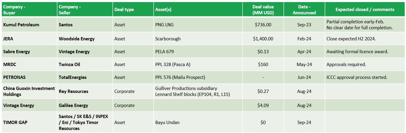 We also saw the announcement in mid-September that Saudi Aramco will increase its stake in MidOcean Energy to 49%, with no deal value announced. This is relevant given MicOcean's 2022 acquisition (2024 completion) of minority stakes in three integrated LNG projects in Australia from Tokyo Gas.
