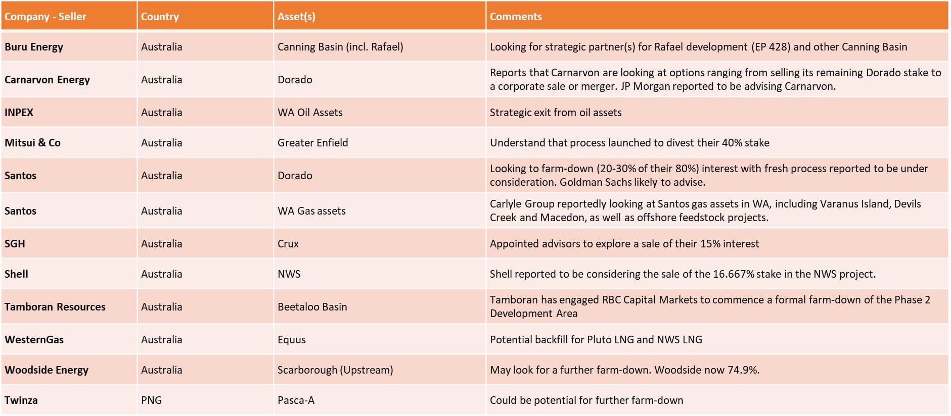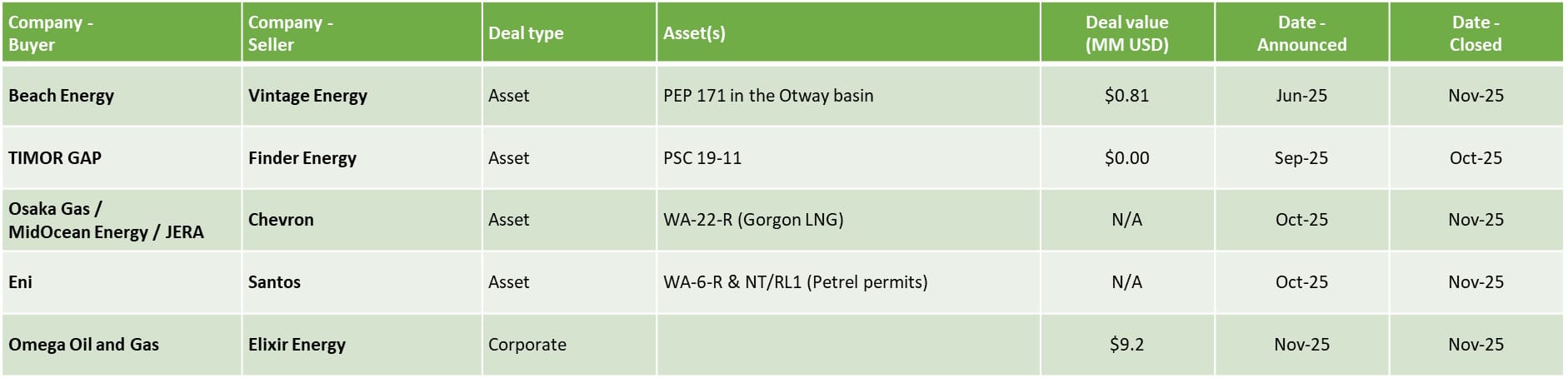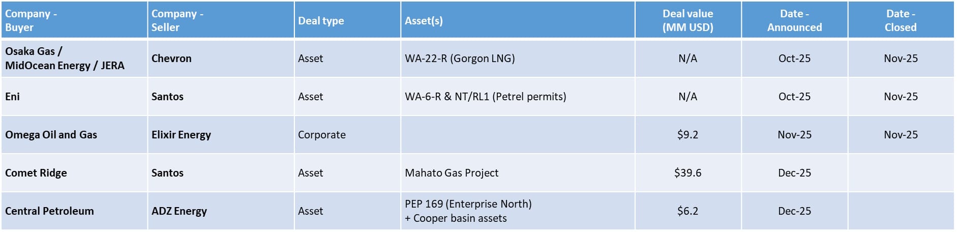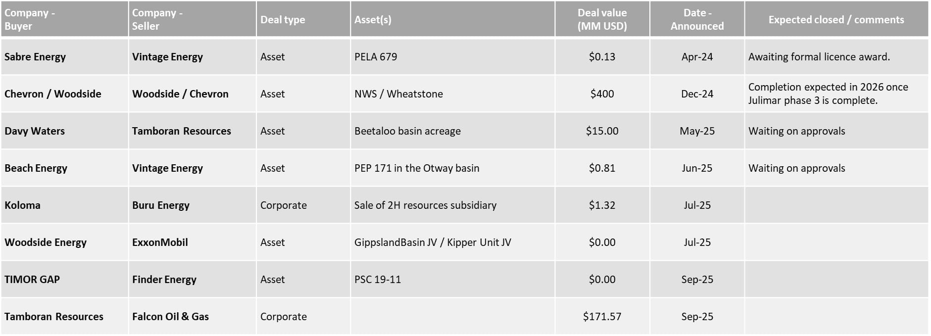 In addition, we also saw a deal between Central Petroleum and Georgina Energy for some Northern Territory exploration permits. However, these appear to be focused on Helium and have therefore not been included.