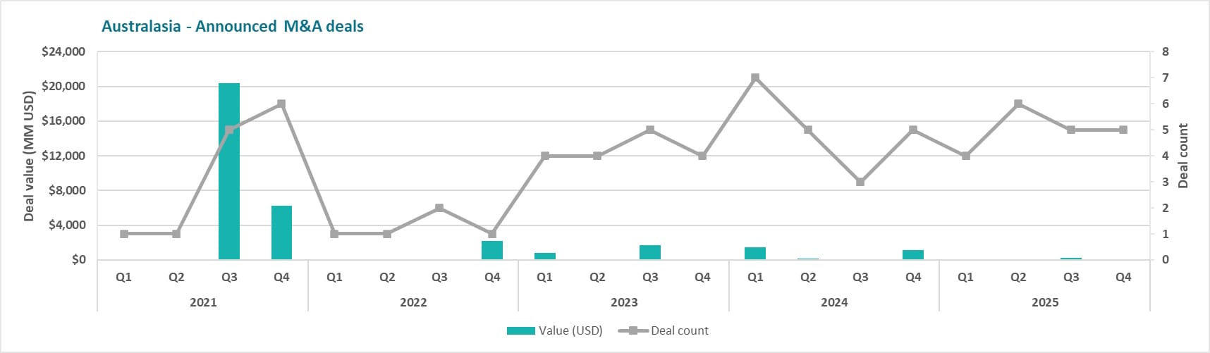 Q4 has seen a further five new deals announced in Australasia, all of which were in Australia. The visible transaction value for these five deals was about US $54.9 million.