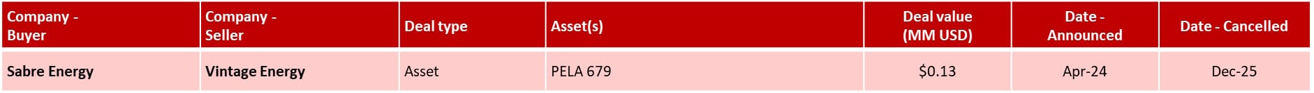 - In late-April 2024, Vintage Energy announced a farmout agreement with Sabre Energy for the latter to acquire a 50% stake in PELA 679. However, on 1st December 2025, Vintage Energy announced that Sabre Energy had given notice of termination of the Farmout Agreement owing to Sabre being unable to secure committed funding to meet the farm-in obligations on terms acceptable to Sabre Energy.