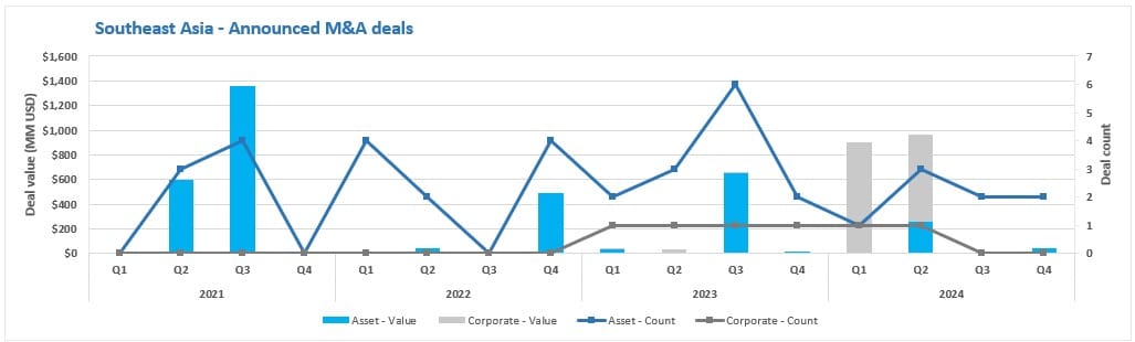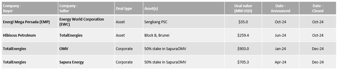 The annual deal count for 2024 is 10 deals with a total deal value of US $1,913 million, with the two major deals for the year being those that saw TotalEnergies acquire the two 50% stakes of SapuraOMV from OMV and Sapura Energy. By comparison, 2023 saw 19 transactions and a total deal value of just over US $840 million.