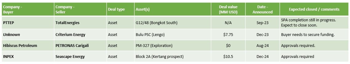 - The first deal was announced in early September 2023, with PTTEP acquiring TotalEnergies last remaining upstream interest in Thailand through the acquisition of TotalEnergies 33.33% stake in block G12/48 (Bongkot South). At the time, they said completion was expected by the end of 2023. However, in their 22nd November 2024 investor presentation they stated the completion of the SPA was still in progress.