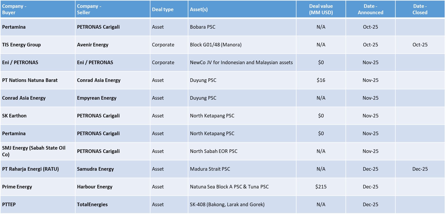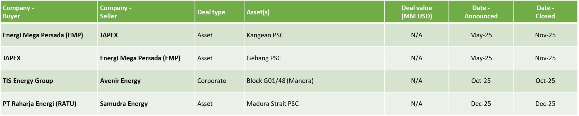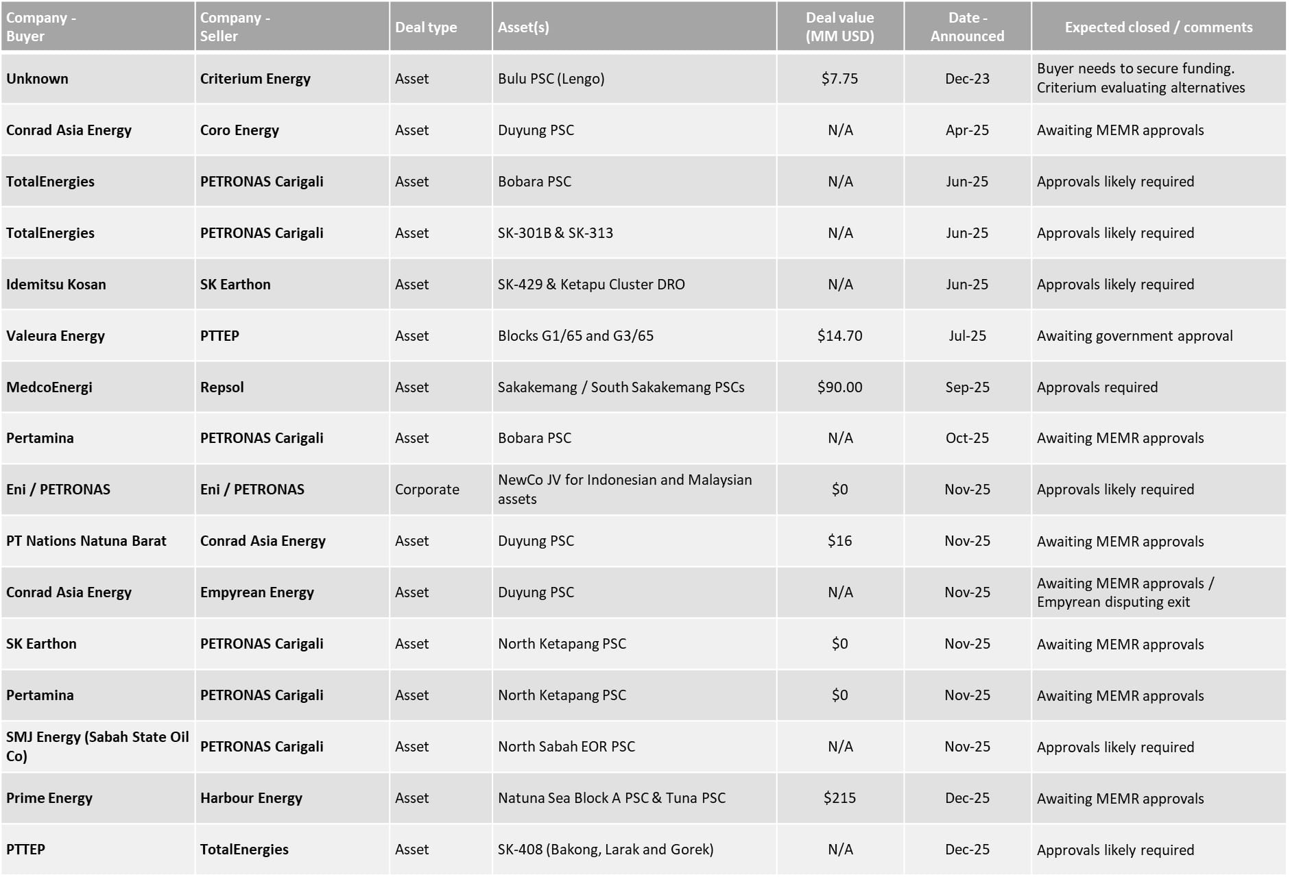 - The first deal was initially announced in December 2023 when an LOI was signed, with the formal agreement coming in May 2024. The deal sees Criterium Energy divest their 45% stake in the Bulu PSC in Indonesia to an as-of-yet unnamed buyer. As of early-September 2024, Criterium announced that they had received some payments from the buyer but there has been little news since. In August 2025, Criterium's presentation stated that they continue to work with buyer to close the transaction but are also evaluating alternatives to preserve value should transaction not close as intended. There has been no further news this quarter and the deal is looking less and less likely to happen.