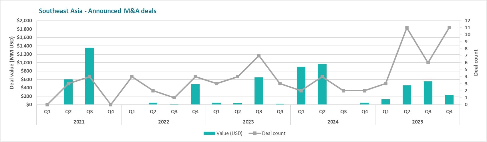 The final deal count for 2025 is 31 deals with a total deal value of US $1,368 million (from the 11 deals with a visible value). By comparison, 2024 saw only 10 transactions with a total deal value of US $1,913 million (from five deals with a visible value).