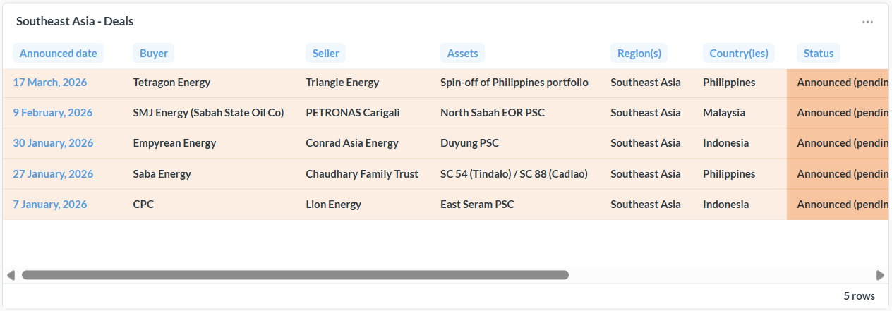 - The next two deals are from mid-June 2025, when TotalEnergies and PETRONAS Carigali announced that they had signed two farm-in agreements related to assets in Malaysia and Indonesia. I haven't seen confirmation that either deal has completed.