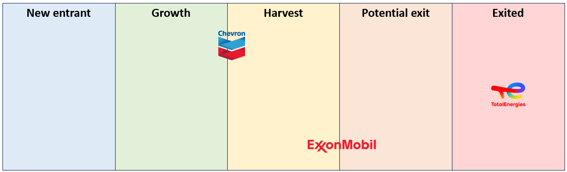 None of the other majors hold an upstream position or are likely to enter. Shell held a historic position but exited in 2018, with BP exiting their own small position back in 1993. Neither ConocoPhillips nor Eni have held a position.