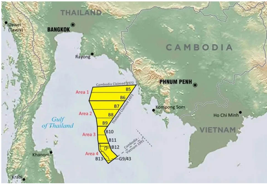 The Thailand-Cambodia OCA covers about 26,000 km2 in the Gulf of Thailand where the maritime claims of Thailand and Cambodia overlap, shown in yellow in the map below.