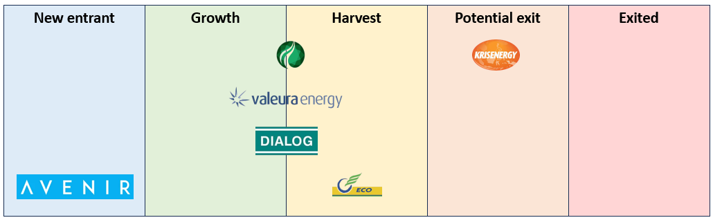 - Valeura Energy: they rationalized their position a bit in the first half of the year, increasing their stake in G10/48 (Wassana) to 100% and divesting their 43% stake in G6/48 (Rossukon). The Wassana field was brought back onstream in December and their focus will be on infill drilling at most of their fields as well as new developments at the Nong Yao field. They have a good cash position and will be on the lookout for new assets, be this in Thailand or elsewhere in the region.