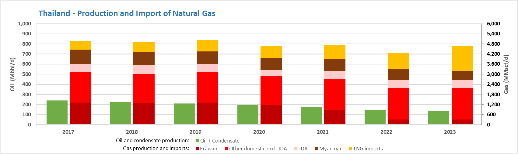 Thailand's domestic production is dominated by gas, which is sent to shore through pipelines for sale in domestic markets. Other key sources of pipegas supply for Thailand come from the Malaysia-Thailand JDA and Myanmar, with LNG imports forming a growing part of the mix since 2011.